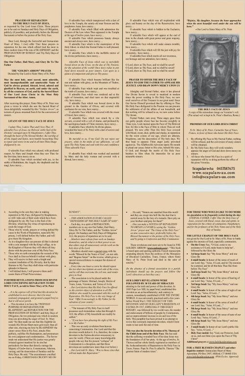 The Golden Arrow Prayer, The Chaplet of the Holy Face , The Litany, The Prayer to offer up the Holy face of Jesus to God, Promises of the Holy Face and Revelations about the Holy Face Devotion.